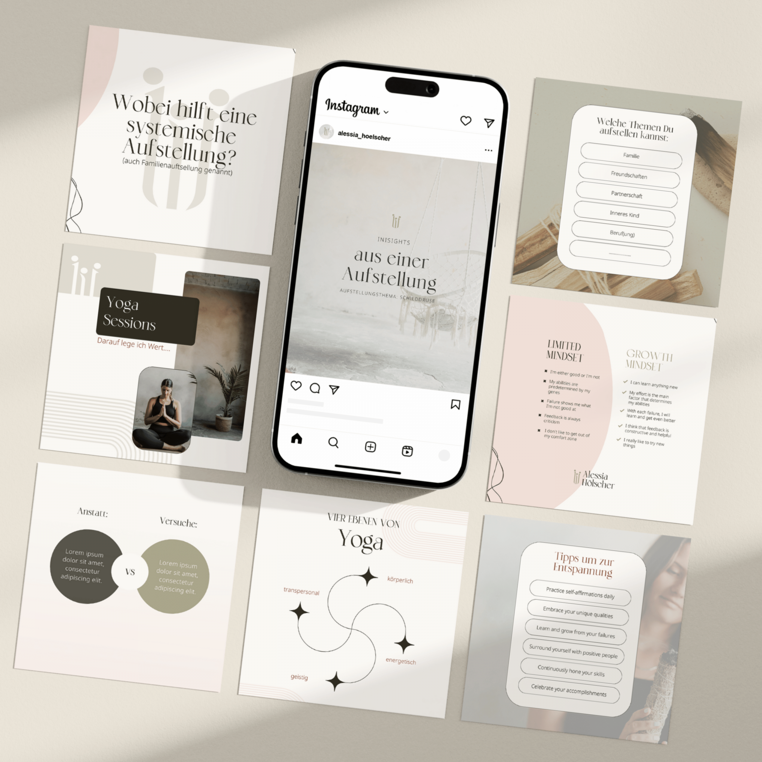 Für Alessia haben wir Social Media Vorlagen entwickelt, die ihre ganzheitliche Arbeit in Yoga, Reiki und Aufstellungsarbeit visuell verkörpern. Die Designs spiegeln ihre Essenz wider und ermöglichen es ihren Soul Clients, bereits beim ersten Kontakt eine tiefe Verbindung zu spüren. So wird ihre Botschaft auch auf Social Media klar, authentisch und fühlbar.