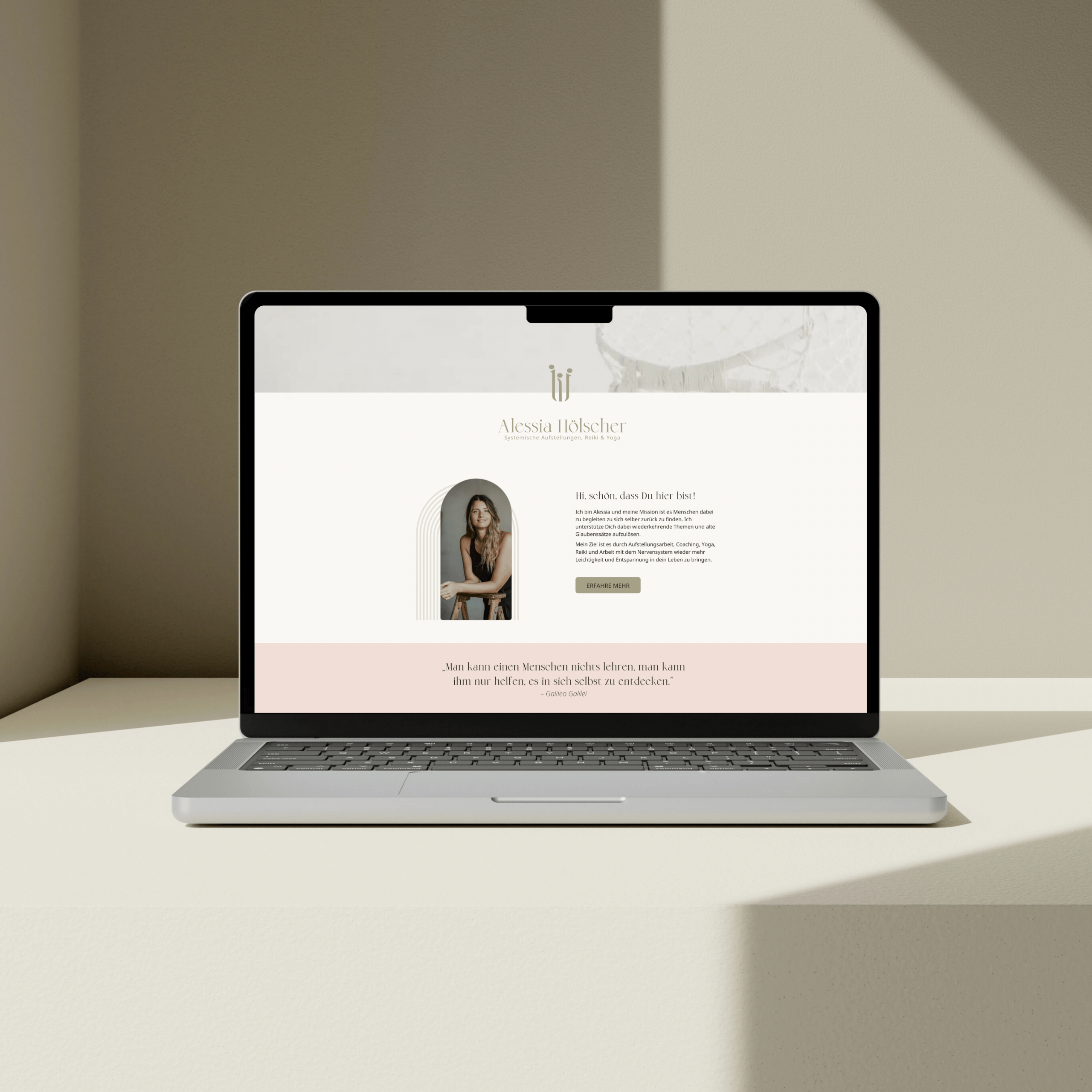 Basierend auf dem entwickelten Branding entstand eine Website, die Alessias Essenz in Design, Sprache und Struktur widerspiegelt. Die Seite lädt Besucher:innen ein, sich mit ihrer Arbeit zu verbinden und bietet gleichzeitig klare Möglichkeiten zur Kontaktaufnahme und Buchung. So wird ihre Vision nicht nur sichtbar, sondern auch erlebbar und verbindend.